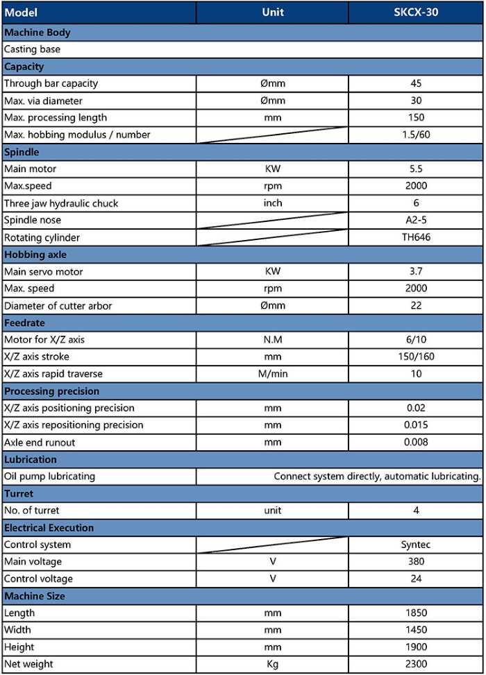The SKCX-30 CNC Gear Hobbing Machine Tool can finish different production methods, such as: turning, milling, drilling, deburring and plunge-cutting etc by once clamping.