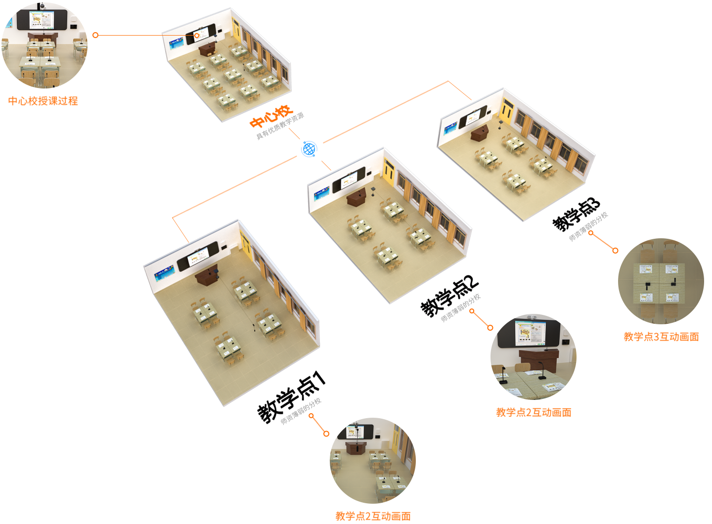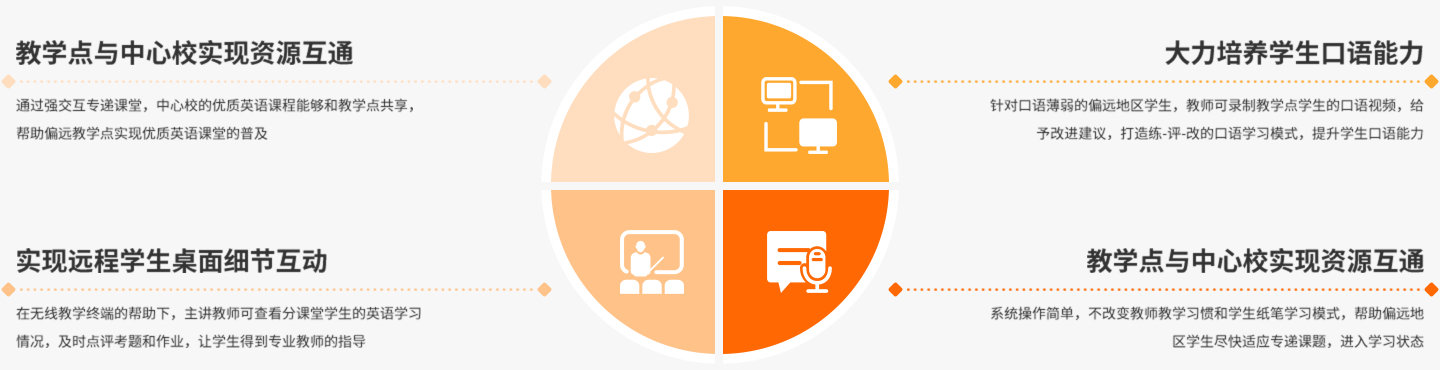 主課堂可任意調(diào)取主分課堂學(xué)生桌面畫面對(duì)比教學(xué),無(wú)需助教,不受距離空間限制,主分課堂共上一堂課,遠(yuǎn)程教學(xué)也能達(dá)至面對(duì)面的教學(xué)效果